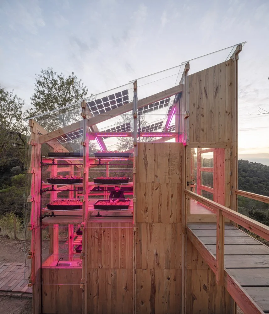 All the necessary lighting for the maximum yield in production was carefully crafted into the wood structure making use of hiding cables, space and for aesthetic cleanliness. Powered by the solar panels and with the most leading technology, the lighting is driven to adapt its color spectrum right from your phone.